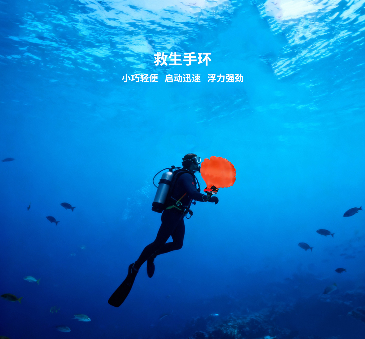 拉開(kāi)控制桿,手腕盒中彈出氣囊迅速充氣膨脹,形成浮力裝置,協(xié)助漂浮在水面,表帶上配有指南針